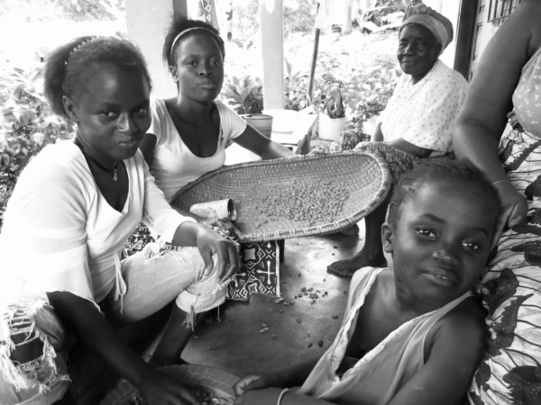 Princess, Sattah, and Esther fend ground peas on the porch while the ol' ma watches from her usual chair.