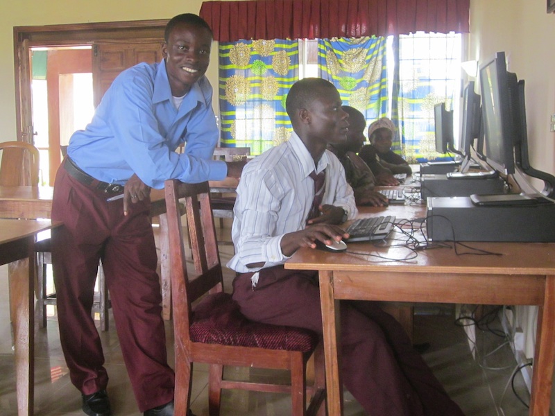 » Morris and Saye use the computers while they wait.
